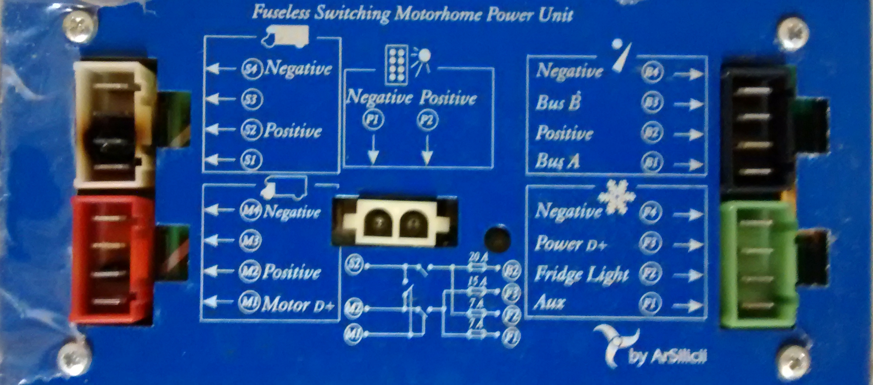 Like the Arsilicii unit, all Alternator current goes into this Fuse board before the electronics then send it on to either the habitation battery or Fridge.