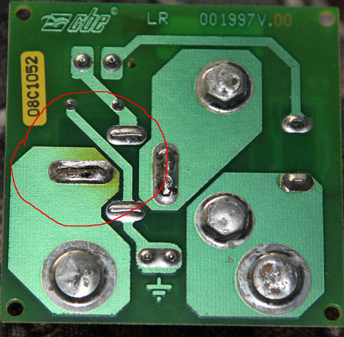 This picture below shows a failing Solder Joint, the design of which isn't one we would expect to reliably carry 50+ amps.