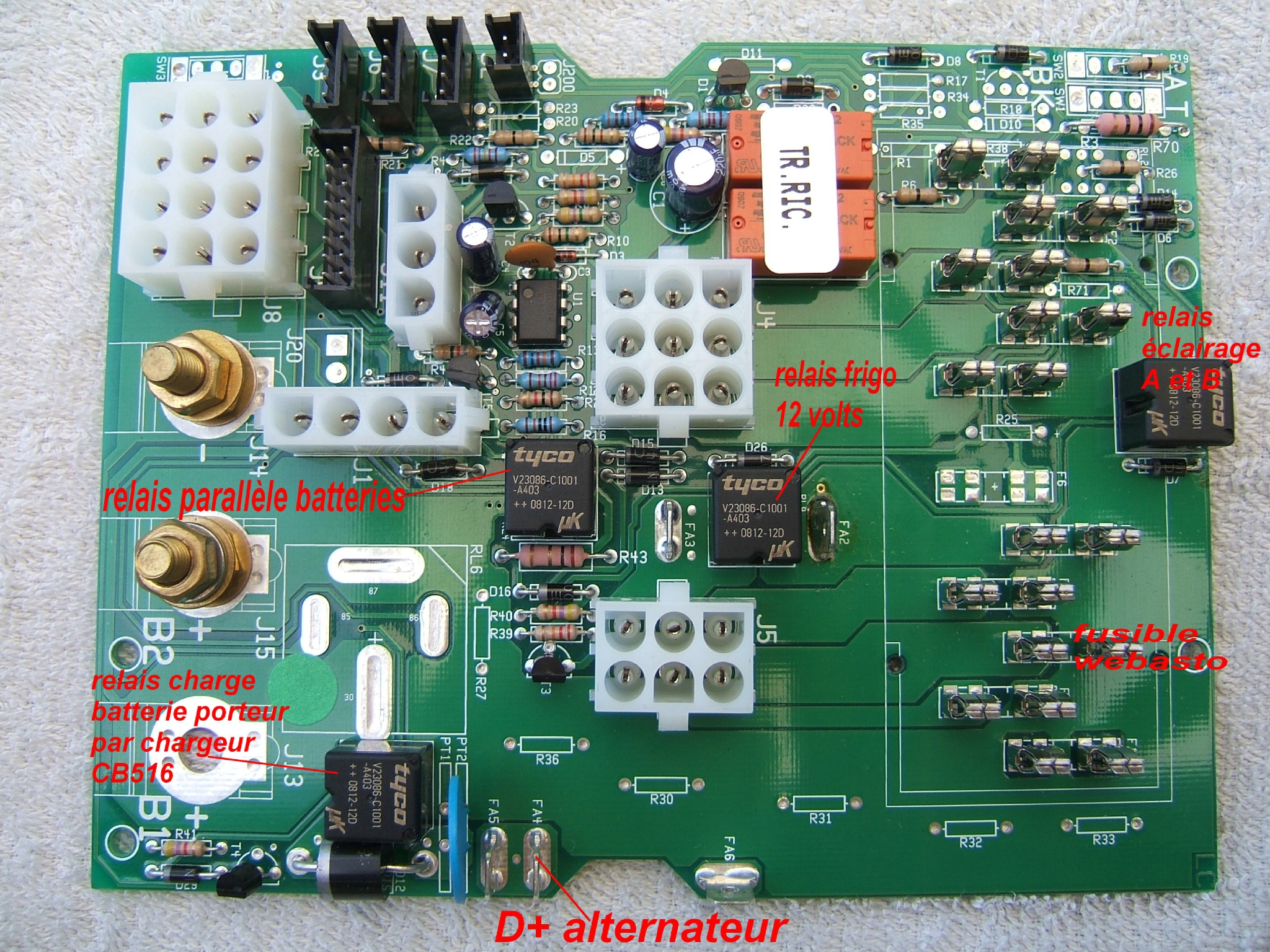 The very small Tyco split charge relay is identified in the photo by the tag "relais Parallele batteries".