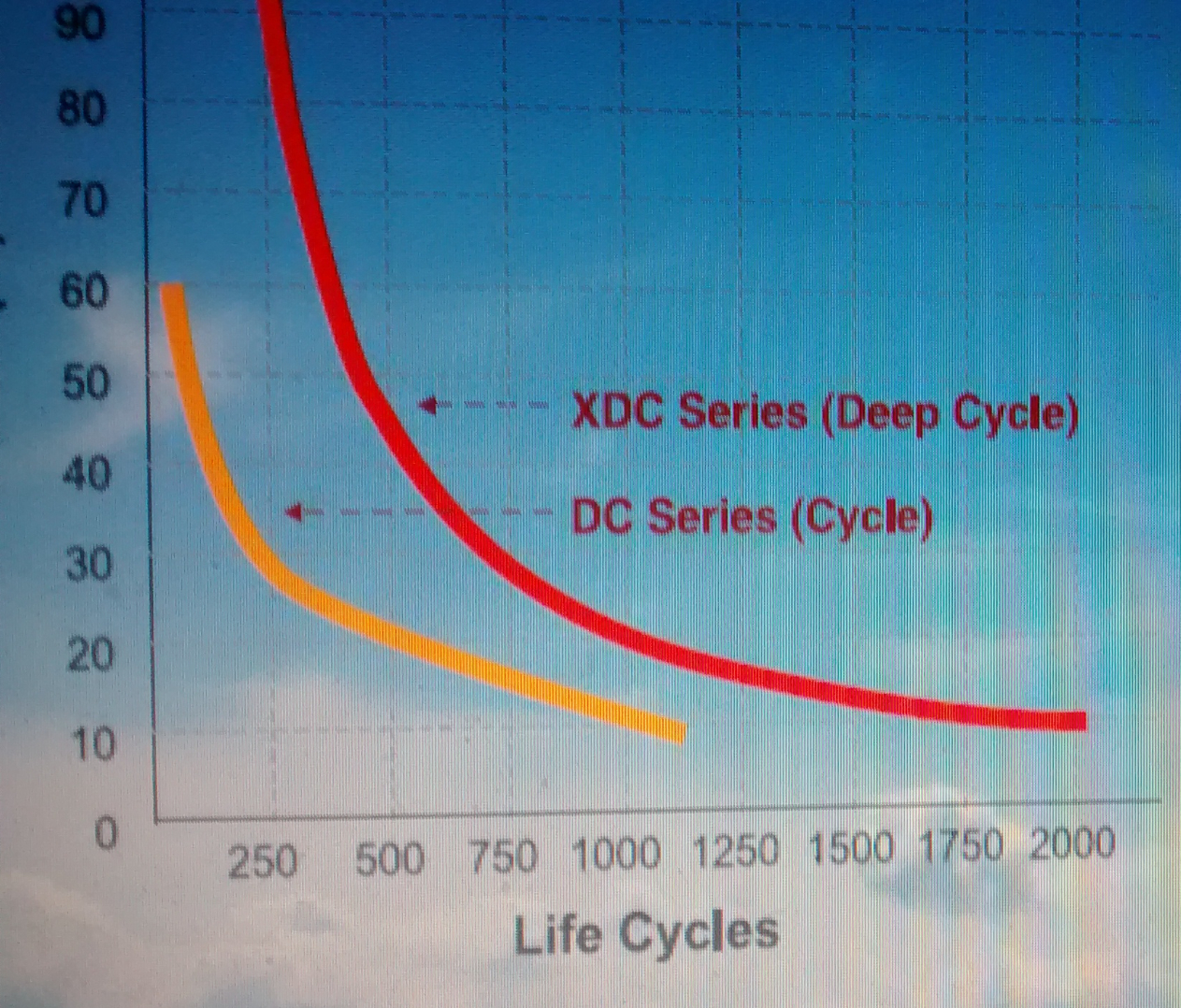 The Graph below from the Battery manufacturers catalogue shows the DC range ONLY achieves around 80 cycles at 50% Depth of Discharge (DOD) matching our test figure.