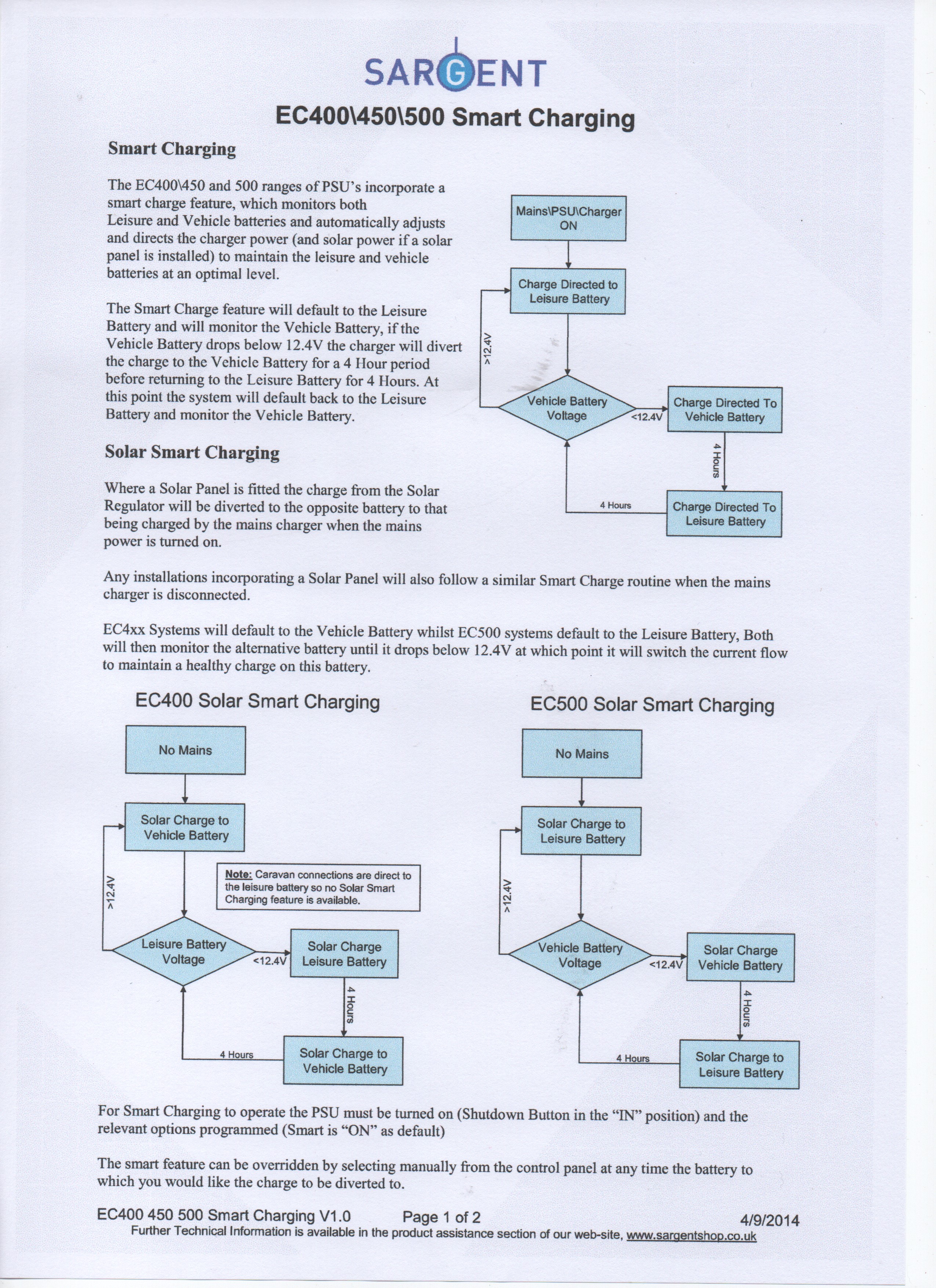 The Sargent EC460/465 has a specific Solar Panel Input that also allows the connection of a solar panel, which will then charge both the vehicle and leisure batteries simultaneously. With this unit an appropriate Solar Regulator should be used, but aside from that all the Solar Power capability available on the EC328 applies to this unit.