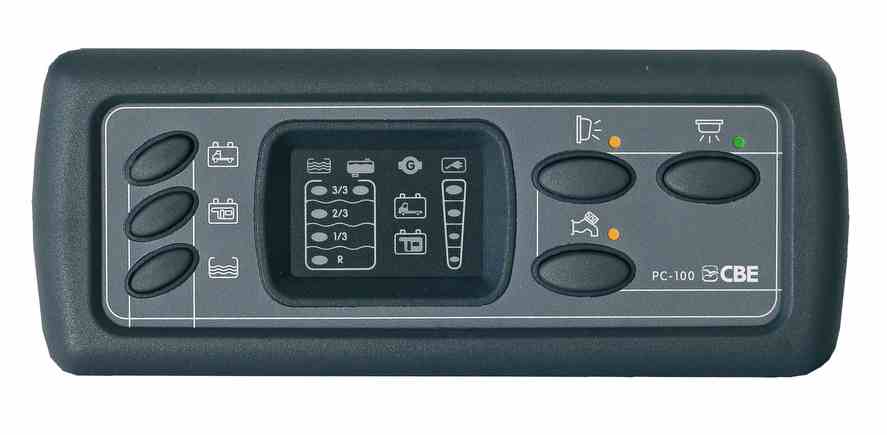 The CBE PC100 controls the Water Pump isolation, lights, Main Power, Water level display for both Waste and Fresh Water, voltage of Habitation area battery, Starter battery status (and charging), etc.